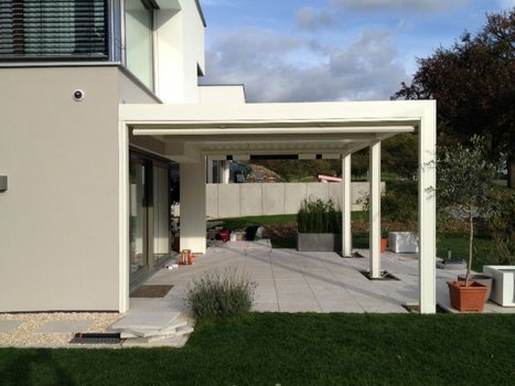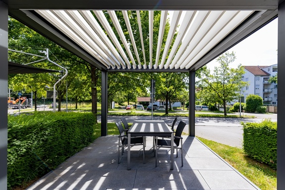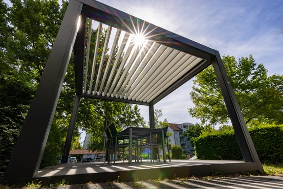 Das kubistische Design der Lamellendächer passt optisch zu allen Baustilen und wird nicht durch Elektrokabel oder Befestigungsmaterial gestört: Sie sind im Inneren des Rahmens verborgen.