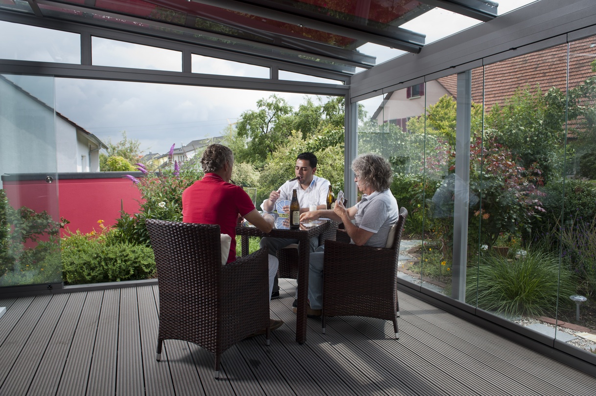 Fast alle Glas-Terrassendächer lassen sich mit Ganzglas-Elementen nachrüsten. Mit einem Terrassendach aus Glas genießen Sie den Sommer auf Ihrer Terrasse selbst bei Regenschauern oder an windigen Sommertagen. Und im Herbst: Sind die Tage noch schön, aber zu kühl um draußen zu sitzen, können Sie Ihre Terrassenüberdachung einfach rundherum schließen und beheizen. Ob flexibel oder festverglast: Wir beraten Sie gerne zu den unzähligen Kombinationsmöglichkeiten von Ganzglas-Elementen.