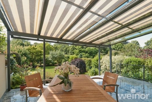 Eine angenehme, wohnliche Atmosphäre und warmes Licht sprechen für eine textile Terrassenüberdachung (Pergola Markise). Absoluten Komfort erhalten Sie dank möglicher Zusatzelemente, wie einer integrierten LED-Beleuchtung: Sie sorgt auch bei geschlossenem Tuch für stimmungsvolles Licht, das sich ganz einfach über einen Funkdimmer bedienen lässt.